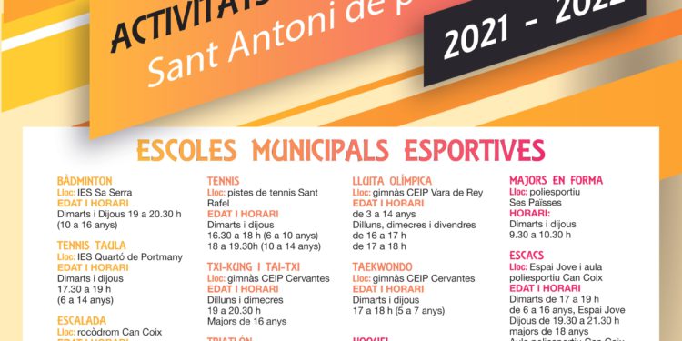 Como cada año, a excepción del año pasado por el COVID 19, el Departamento de Deportes de Sant Antoni de Portmany pone en marcha las escuelas deportivas municipales. Para el curso 2021-2022 hay la novedad de las escuelas de triatlón y hockey, que se suman a las ya disponibles de bádminton, tenis de mesa, escalada, gimnasia artística masculina, lucha olímpica, taekwondo, tenis, txi kung y thai txi, fitness y salud, mayores en forma, ajedrez y tiro con arco.