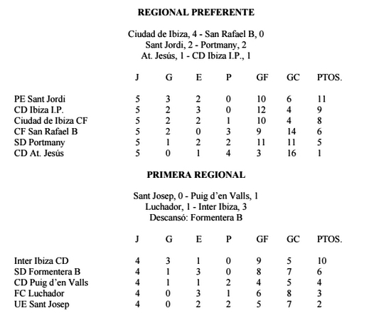 @Noudiari / La liguilla de Regional Preferente, que este domingo cerró la primera vuelta, está más igualada que nunca. El Sant Jordi no pudo aprovechar el tropiezo del CD Ibiza, que por la mañana empató en el campo del Jesús (1-1), y también hizo tablas frente al Portmany (2-2). El Ciudad de Ibiza, por su parte, hizo los deberes y goleó al San Rafael B por 4-0.