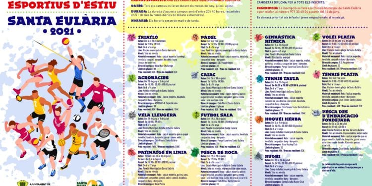 Durante los meses de junio, julio y agosto, y con una duración de 20 a 40 horas, el Ayuntamiento de Santa Eulària celebra este verano los Campus Esportius d’Estiu de 2021, en colaboración con diferentes clubes y federaciones, en los que pueden participar jóvenes desde los 5 hasta los 16 años. Como cada año, habrá una gran variedad considerable de deportes y actividades, que en total serán 15.