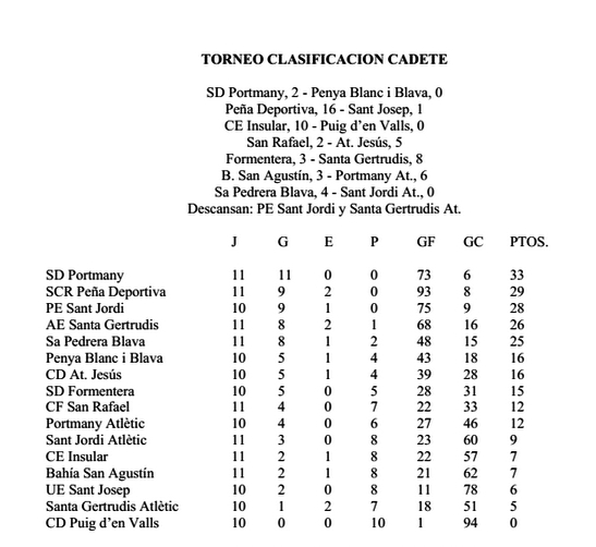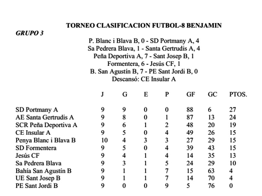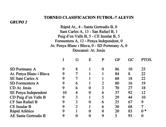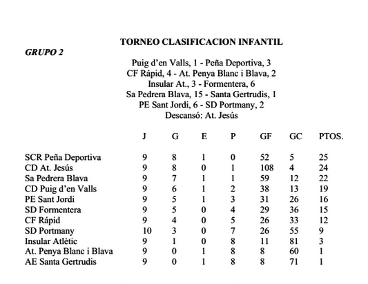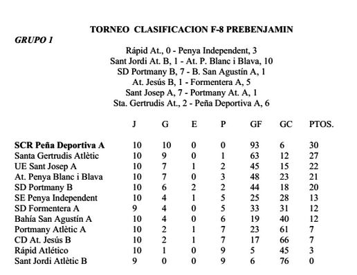 La Peña Deportiva, mientras tanto, logró el campeonato hace varios días tras vencer a su principal rival, el Santa Gertrudis Atlètic (2-6), en el grupo 1 prebenjamín. Lo mismo hizo el Portmany este domingo tras golear por 10-0 al Sant Jordi en el grupo 3 prebenjamín. El conjunto de Juan López y José Antonio Ramón lleva números de récord: diez victorias, 133 goles a favor y ninguno en contra.