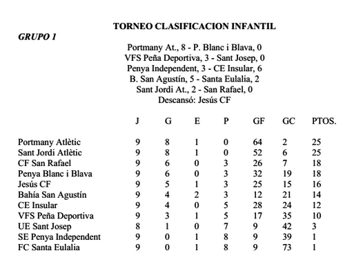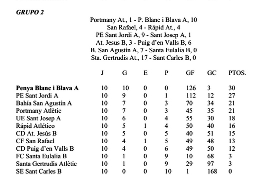 La Penya Blanc i Blava, por su parte, venció esta jornada por 1-10 al Portmany Atlètic y por 6-0 al San Rafael para llevarse los títulos en los grupos 2 benjamín y prebenjamín. También ha vencido en todos sus partidos y mostrando un gran acierto ofensivo: 126 y 97 goles a favor, respectivamente.