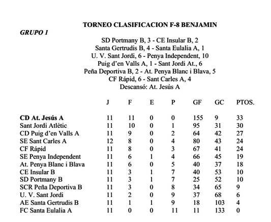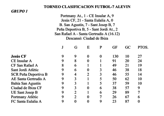 El Atlético Jesús y la Penya Blanc i Blava han entonado el alirón en dos ocasiones. El conjunto rojiblanco venció este sábado por 21-0 al Santa Eulalia A para vencer en el grupo 1 alevín con nueve victorias en los mismos partidos y la friolera de 130 goles a favor y sólo 10 en contra. El Jesús benjamín, que aún ha logrado más goles (155), también se aseguró el primer puesto en el grupo 1 la pasada semana.