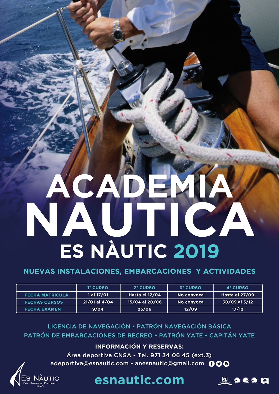 En el portal http://areadeportiva.esnautic.com/academia-nautica/inicio se ofrecen todos los detalles sobre la Academia. Las inscripciones pueden realizarse de manera presencial en el edificio del Área Deportiva, por teléfono llamando al 971 340 645 (extensión 3) o vía correo electrónico escribiendo a adeportiva@esnautic.com o anesnautic@gmail.com.