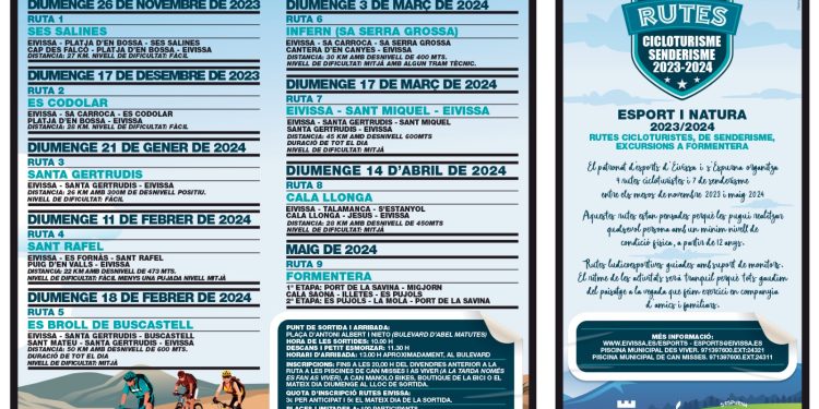 El Patronat d’Esports de l’Ajuntament d’Eivissa ha organitzat nou rutes cicloturístiques i set de senderisme que es realitzaran entre els mesos de novembre 2023 i maig de 2024, ha informat el Consistori en un comunicat de premsa.