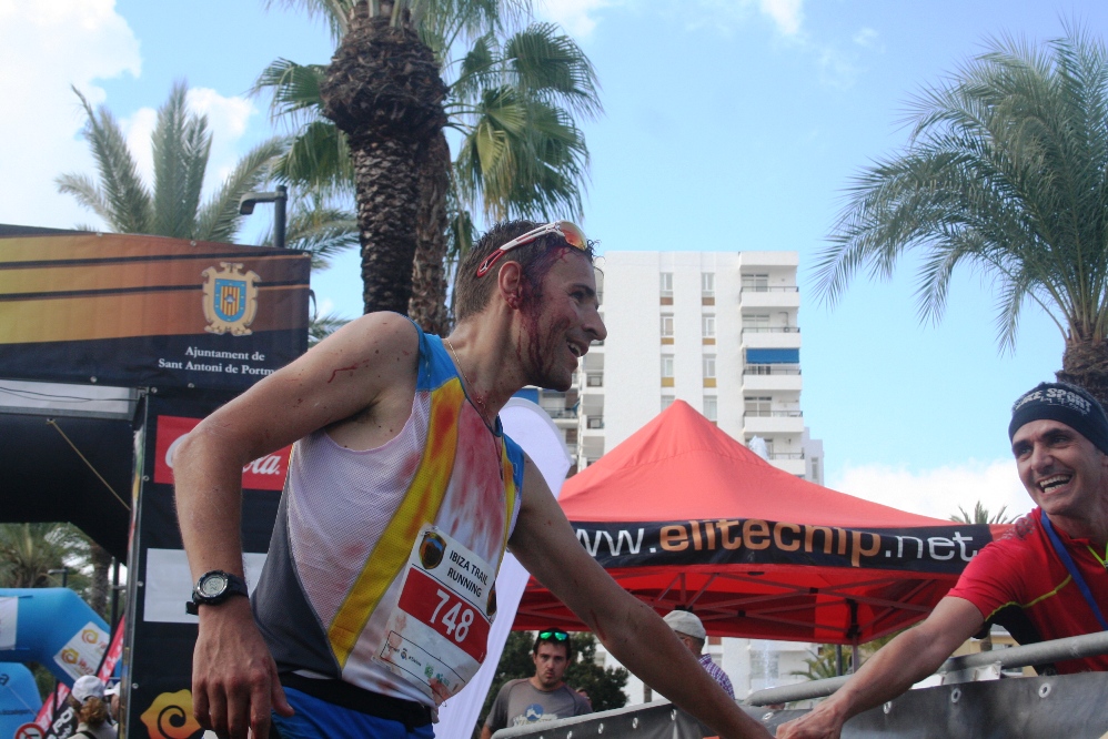 @C. Vidal / Franco Collé (Team Tecnica) se proclamó campeón de la octava edición de la Ibiza Trail Maratón, que se celebró este domingo por la mañana en Sant Antoni con una numerosa presencia de atletas -un total de 654 en línea de meta- y aficionados. El italiano, eso sí, fue la viva imagen de la dureza de esta carrera de montaña, cruzando la línea de meta cubierto de sangre tras sufrir una brecha en la cabeza por la que tuvieron que aplicarle seis puntos de sutura.