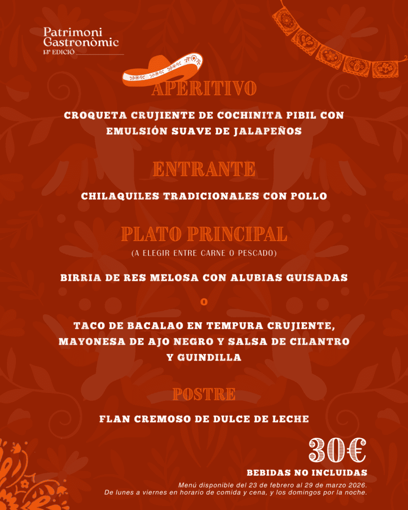 El menú consta de un aperitivo “Croqueta crujiente de cochinita pibil con emulsión suave de jalapeños”, un entrante “Chilaquiles tradicionales con pollo” y luego un principal a elegir entre una opción de carne o de pescado “Birria de res melosa con alubias guisadas” o “Taco de bacalao en tempura crujiente, mayonesa de ajo negro y salsa de cilantro y guindilla” y, como postre, un “Flan cremoso de dulce de leche”, una propuesta que no dejará indiferente a nadie.