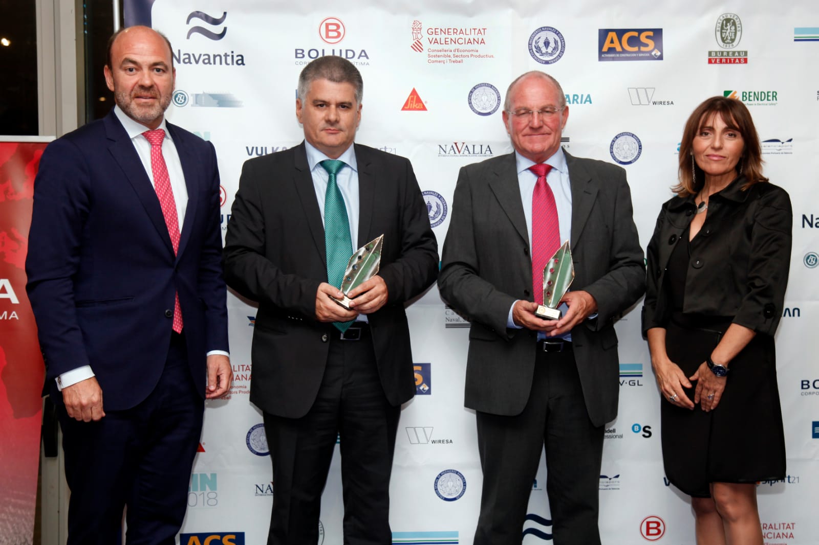 El catamarán Eco Aqua ha sido galardonado como la construcción naval más destacada de 2017 por la Asociación de Ingenieros Navales y Oceánicos de España. Guillermo Alomar, director de Flota de Baleària, recibió el galardón acompañado de Antonio Pacheco Etchevers, director de la división de fibra del astillero constructor del buque, Gondán, en el marco del 57º Congreso de Ingeniería Naval e Industria Marítima que se celebra en València, y cuya conferencia inaugural el miércoles fue a cargo del presidente de Baleària, Adolfo Utor.