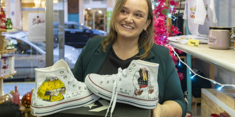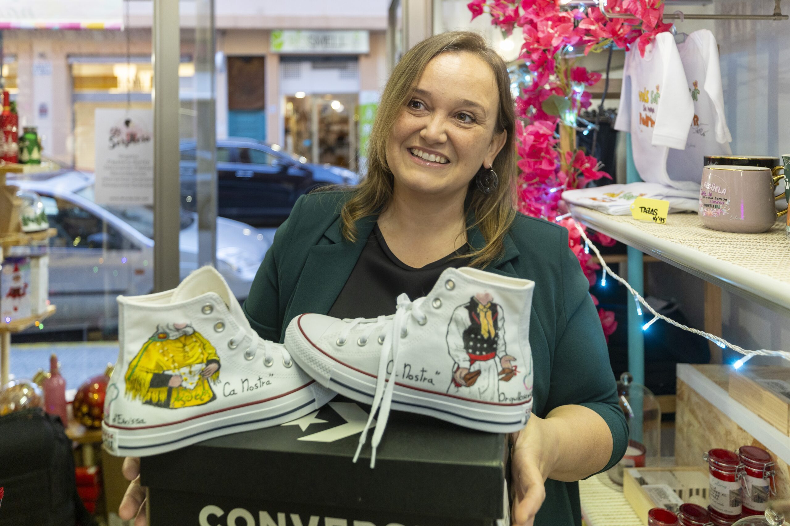 Otra característica de Eulàries es que todos los productos están hechos y diseñados de manera personal. “Todos los diseños son nuestros”, comenta Olivia Cardona mientras me muestra unos abanicos con lemas como ‘Nascuda entre xarxes i sal’, ‘Sempre al cor’ o ‘Ca meua’. También son propios los dibujos de temática pagesa que convierten unas bambas Converse en una pieza única y especialísima: “Suelo hacer una foto y, a partir de esta imagen, inicio el diseño y por ejemplo, las Converse se pintan a mano”.