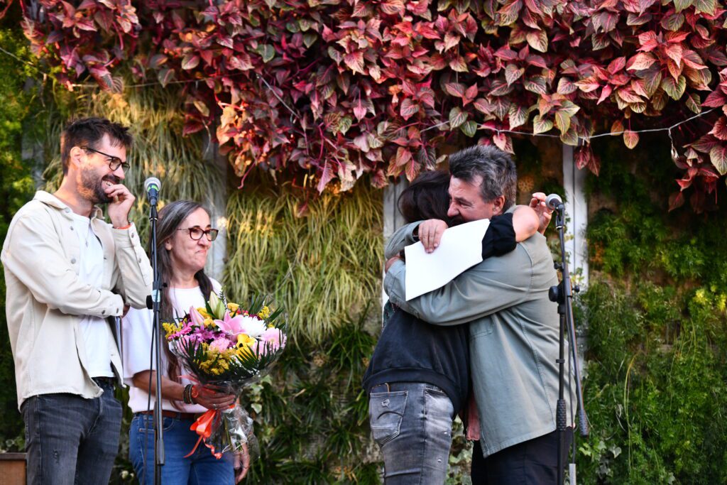 Juanito Marí abraza a Isabel Lambour, hasta hace poco coordinadora del mercadillo, un puesto que ahora recae en Pere Seguí, a la izquierda de la imagen donde también aparece Lucía Marí con un ramo de flores. Fotos Arsen Voronyy