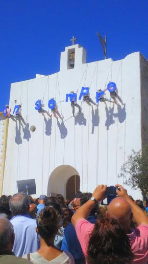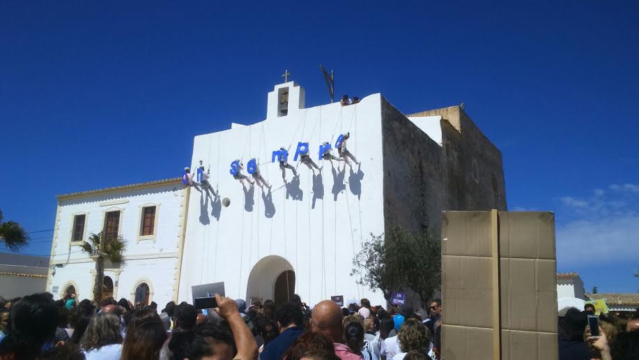 Uno de los momentos más impactantes y aplaudidos de la movilización ha sido cuando varios componentes del grupo de escalada ‘Colgados de Formentera’ se han descolgado de la iglesia de Sant Francesc Xavier con las letras de ‘On sempre’ pegadas a la espalda.