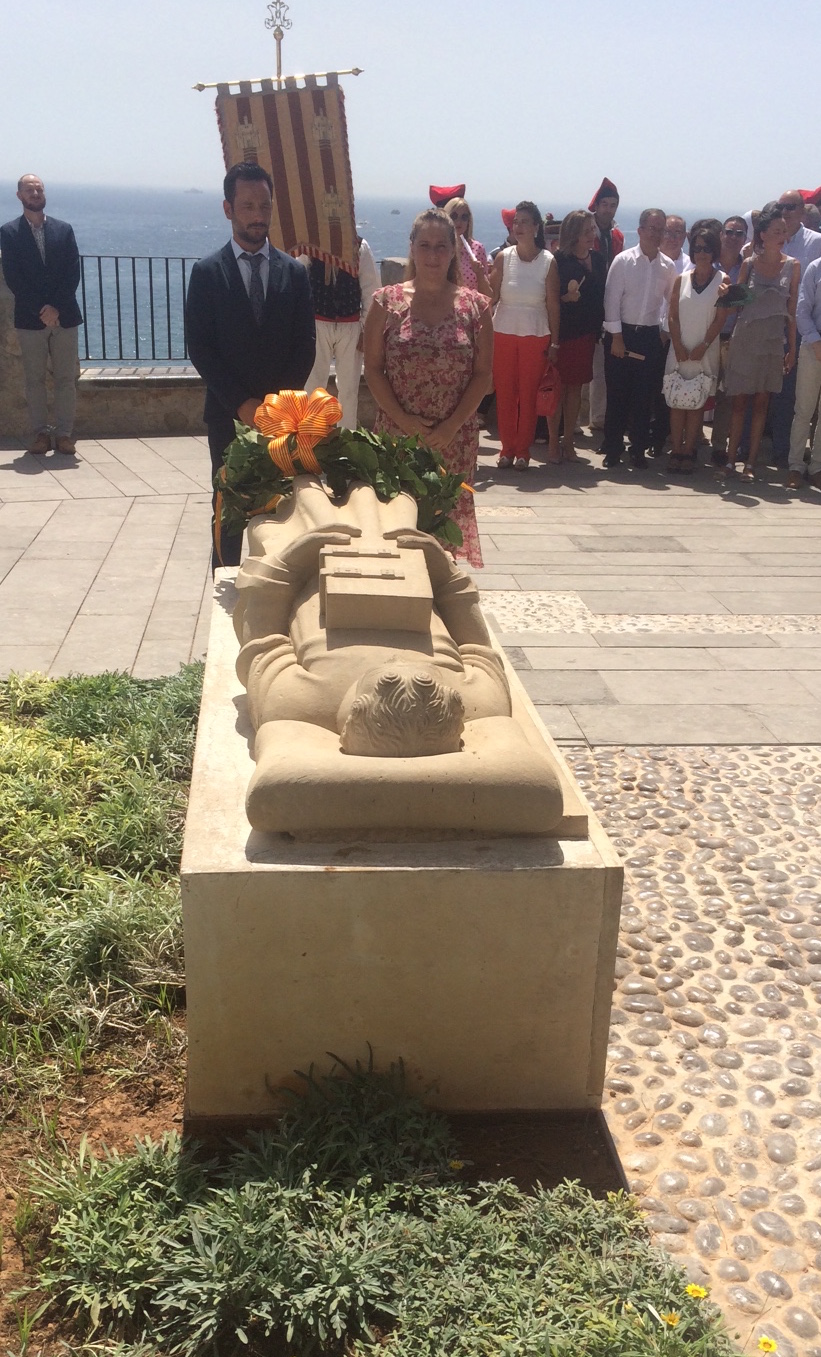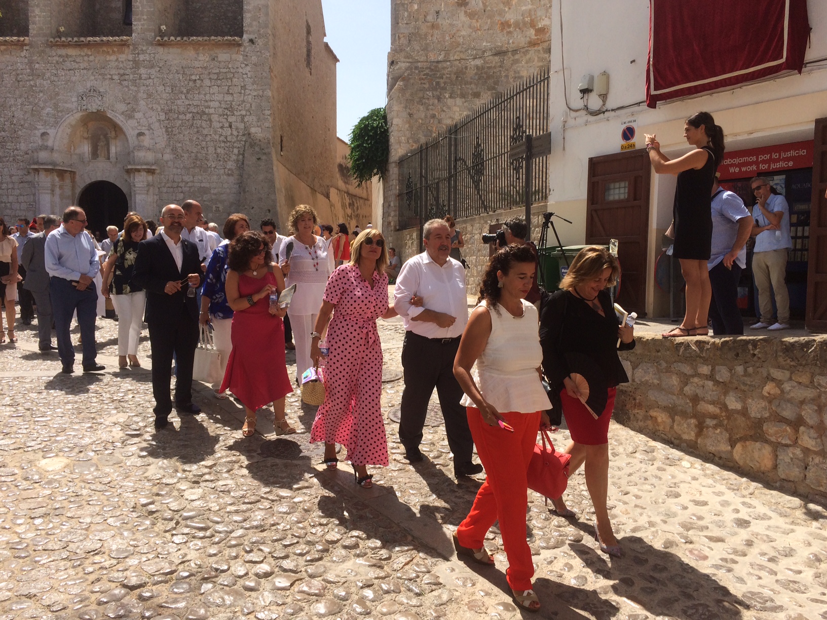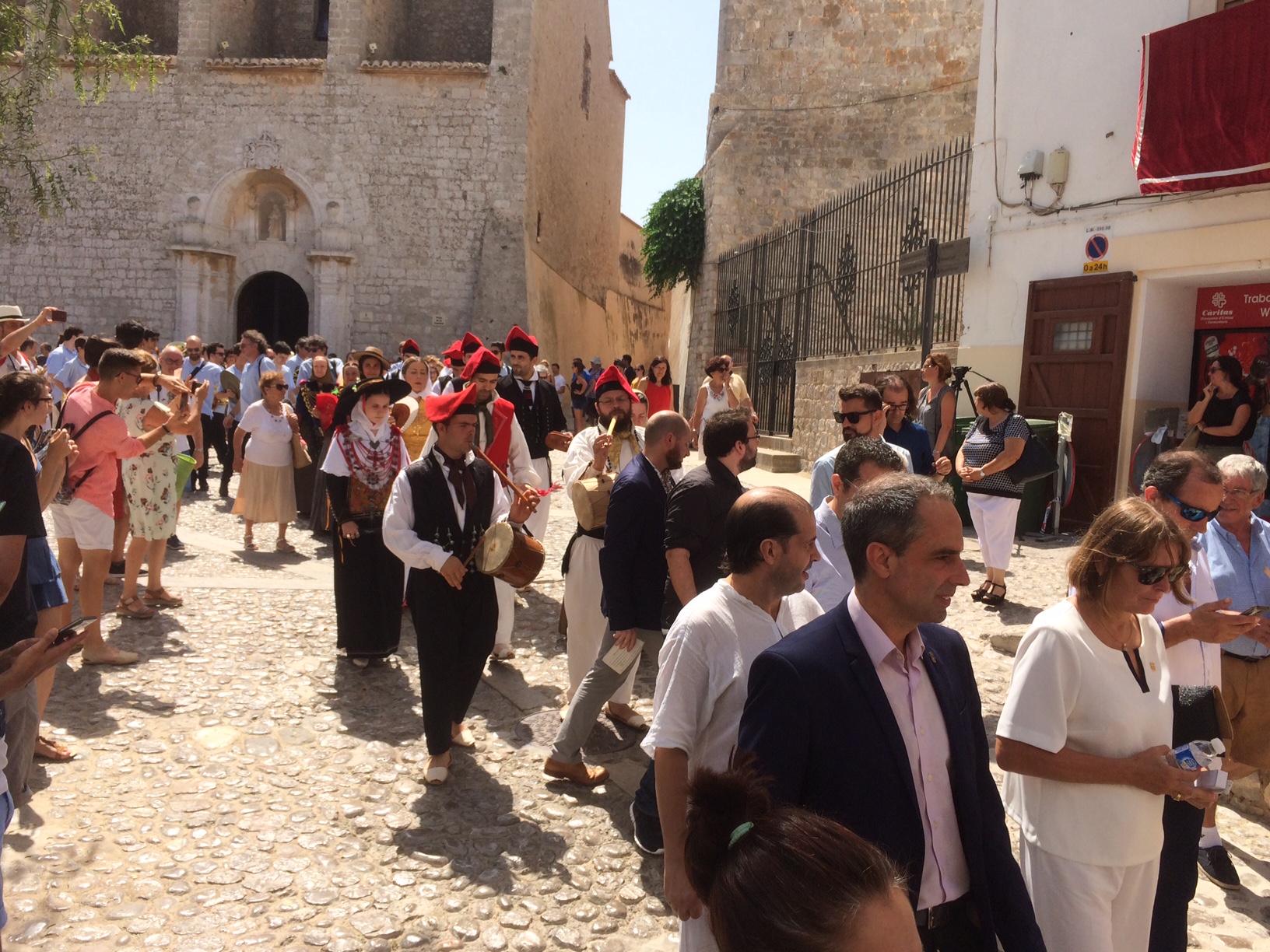 Tras la parada en la capilla de Sant Ciriac, la comitiva ha continuado su descenso por las empedradas calles de Dalt Vila para llegar, al final, a la estatua de Guillem de Montgrí. Eso sí, antes había que pasar por delante de la puerta de Can Botino, donde esperaban el alcalde Rafa Ruiz, la diputada Sofía Hernanz, y los tenientes de alcalde, Alfonso Molina, Joan Ribas y Elena López.