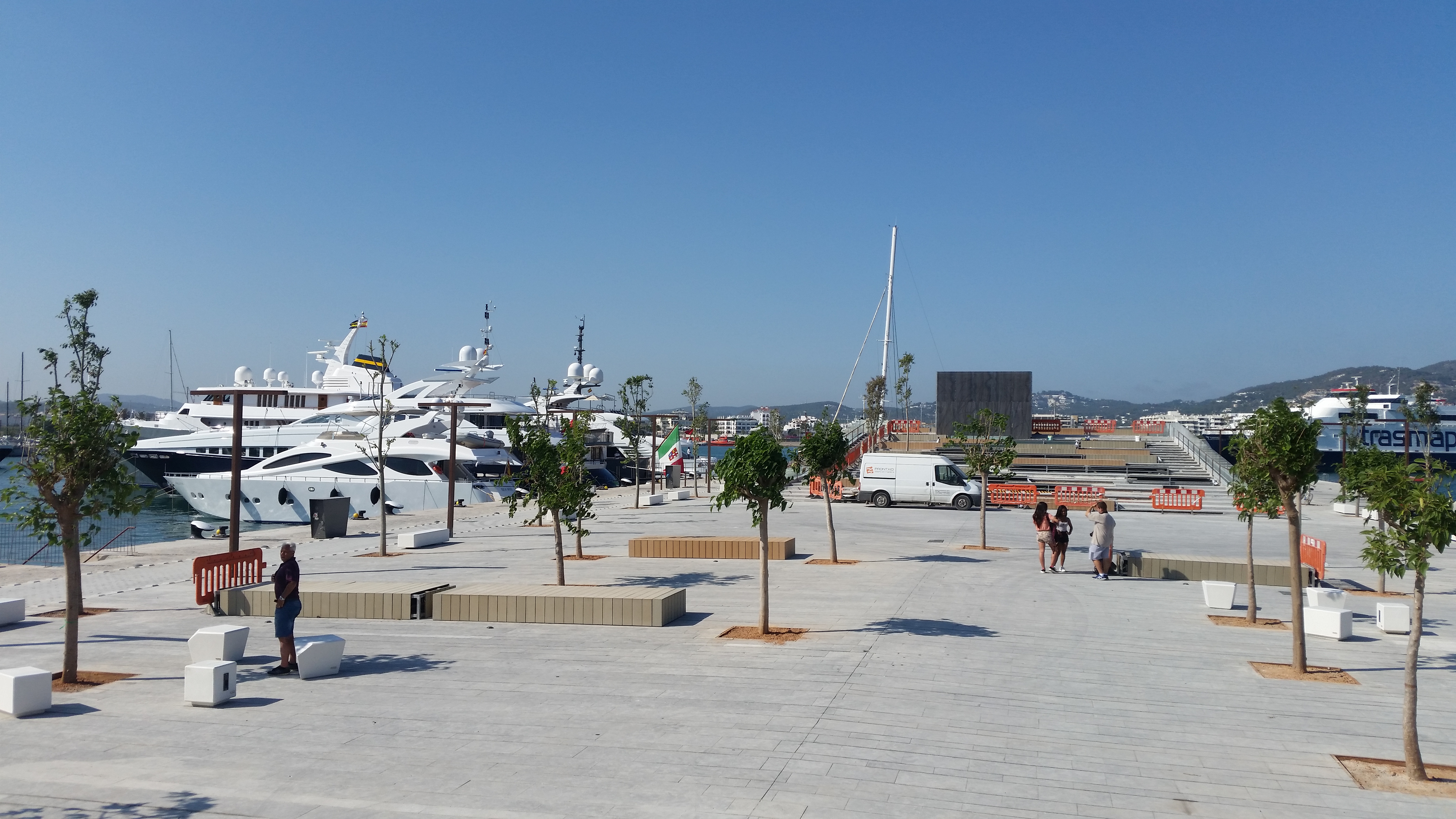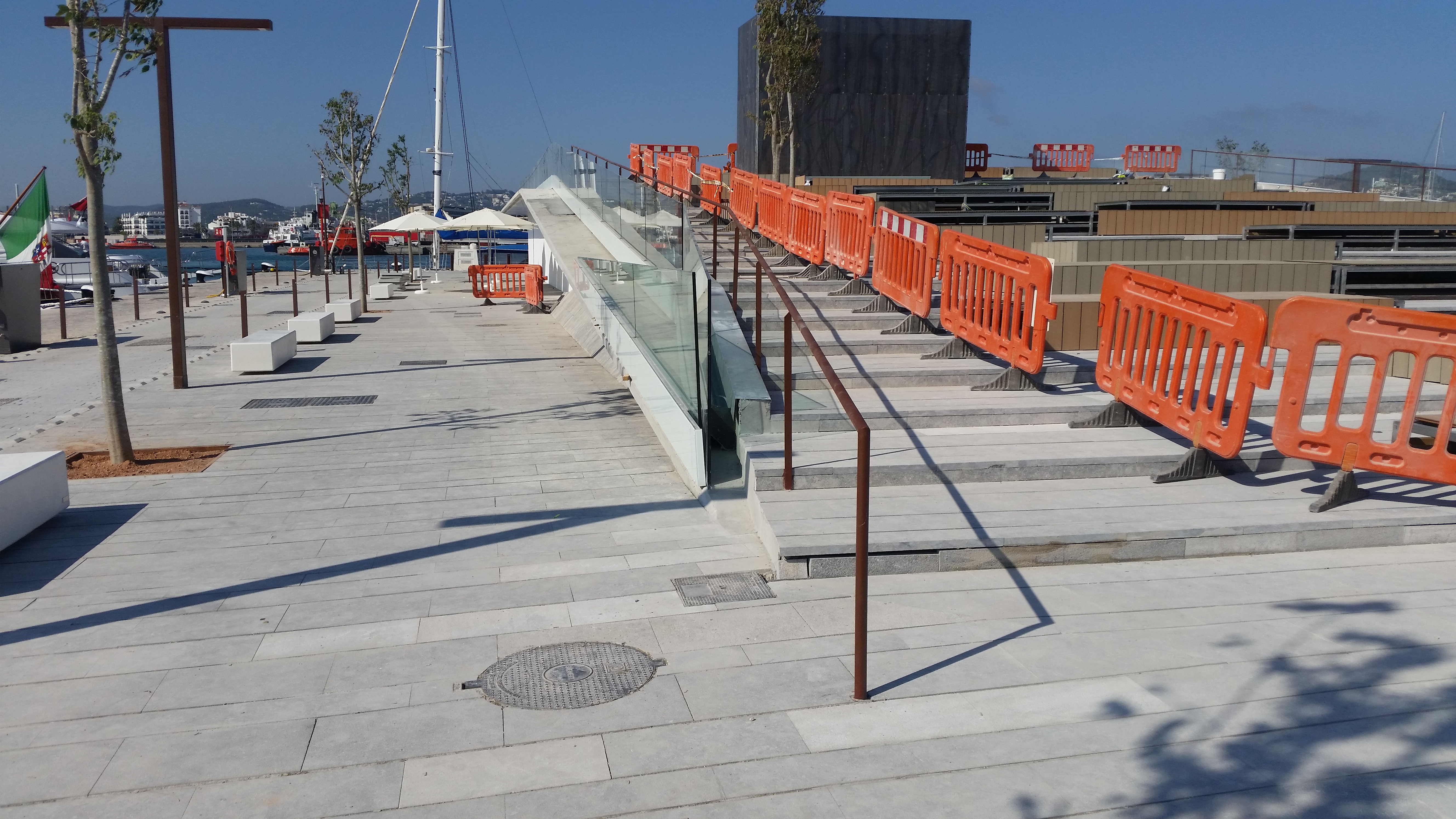 @Noudiari/La nueva plaza de Es Martell del puerto de Ibiza ya se puede visitar, y de hecho, algunos turistas aprovechaban este viernes por la tarde para pasear por la zona o sentarse en sus bancos a descansar. No ocurre lo mismo con el mirador, que tenía previsto abrirse este viernes, pero sigue cerrado con vallas, visiblemente inacabado.