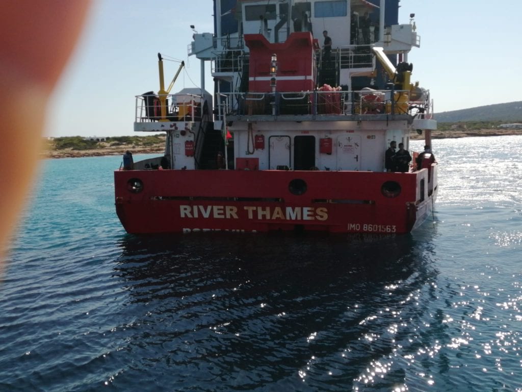 Buque River Thames varado en arena Sur de Formentera. Inspectores informan que no sufre avería ni hay compartimentos inundados por el momento. El armador presentará plan de reflotamiento a Capitanía y ha contratado remolcador. Movilizados Marta Mata y Acrux #SeguridadNautica pic.twitter.com/csBmbmffOH