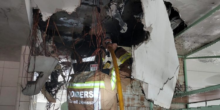 La zona ha sido evacuada por protección, pero no porque haya existido un peligro real para las personas, explican desde el Parque Insular de Bomberos de Ibiza, que trasladado al lugar dos vehículos y seis efectivos para hacer frente a la emergencia. Para poder apagar las llamas, los profesionales se han visto obligados a romper el falso techo justo encima de la recepción.