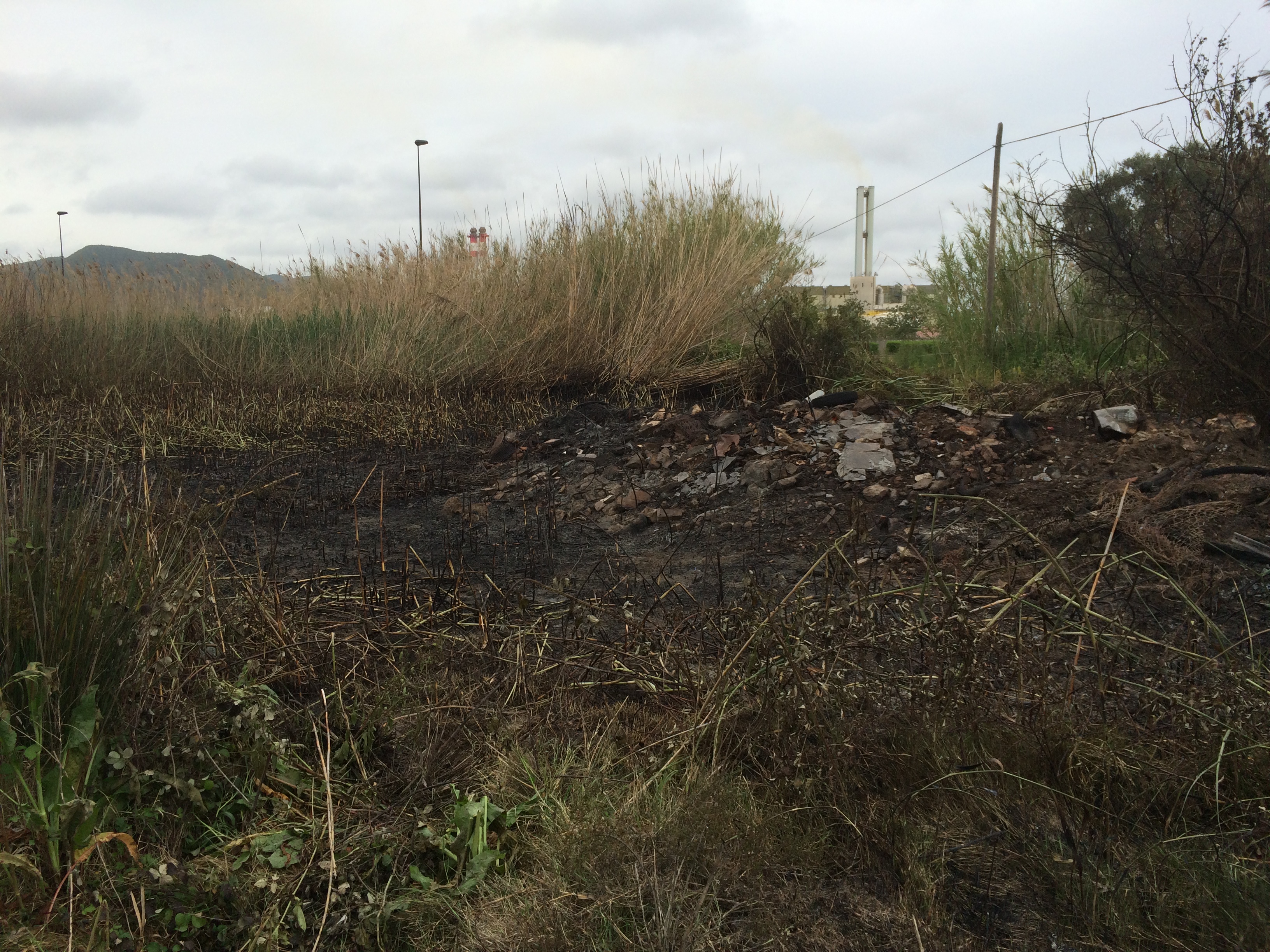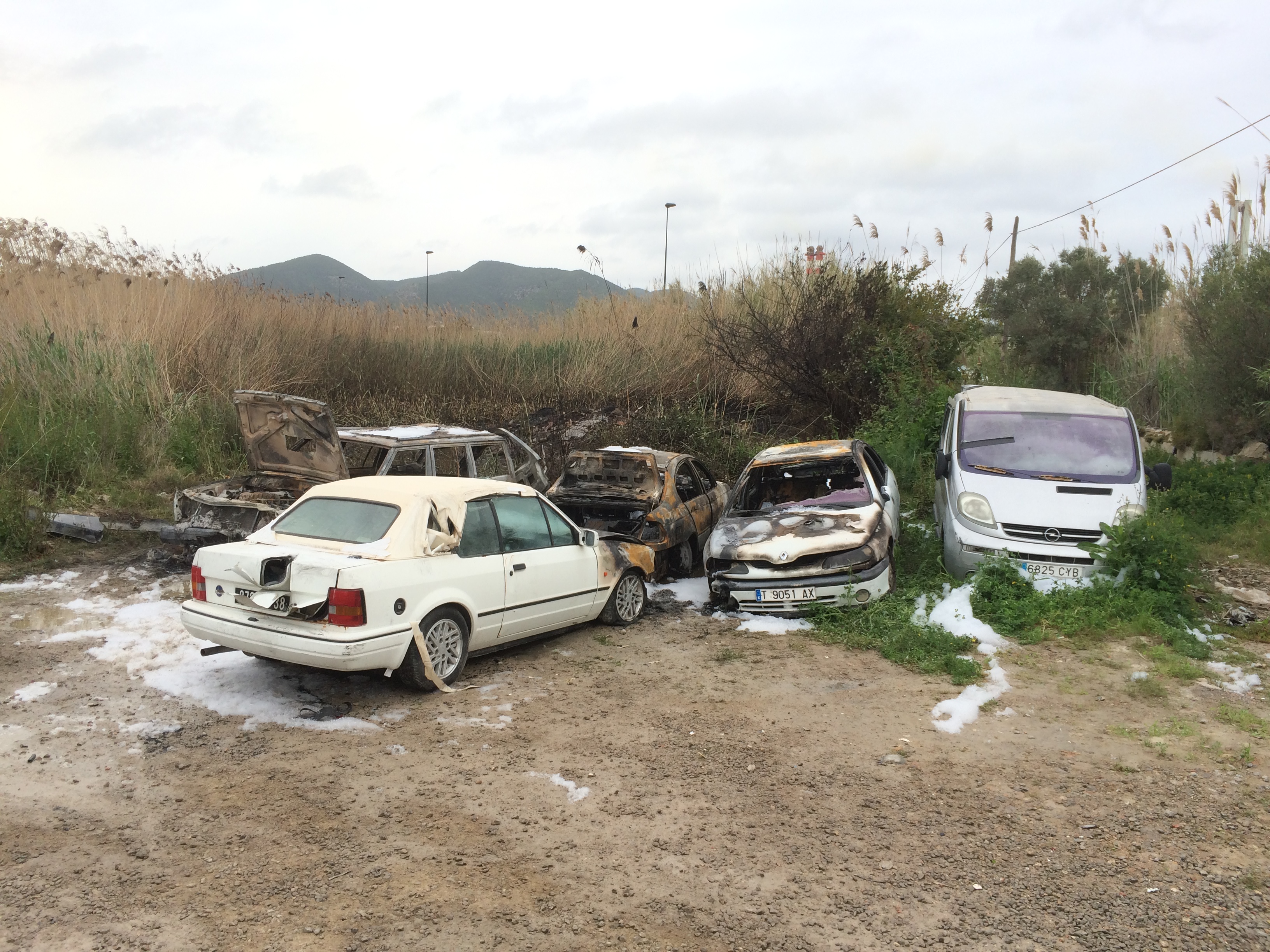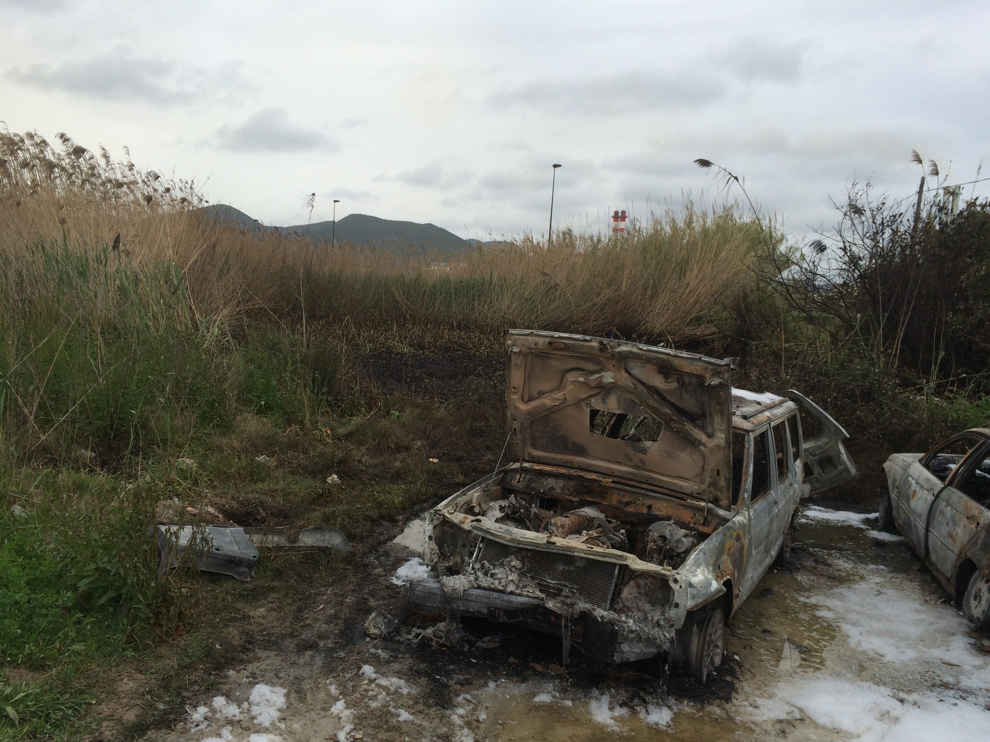 Los coches se encuentran aparcados junto al Taller Pitiuso, ubicado dentro del humedal, que se ha visto afectado por el fuego en un área de 500 a 1.000 metros cuadrados, según ha informado el Ayuntamiento de Ibiza.