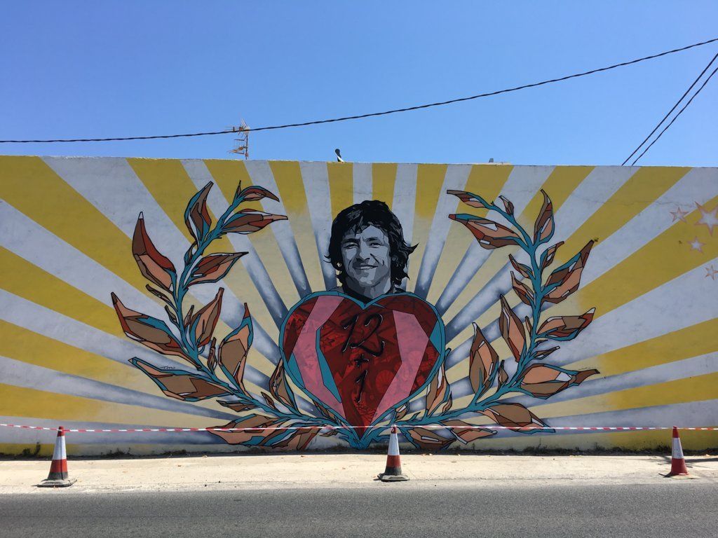 «Me dijeron que era muy abierto, muy de la calle. Quería plasmar eso, pero sin olvidar su gloria deportiva». Su rostro sonriente sobre un corazón con veladura, que crea un efecto como de un grafiti pintado sobre otros grafitis, forman el centro de la composición que se rodea de los laureles que tantas veces colgaron de su cuello. Para la realización de la obra el artista que ha contado con la colaboración del artista local Tito y el apoyo de Montana Colors.