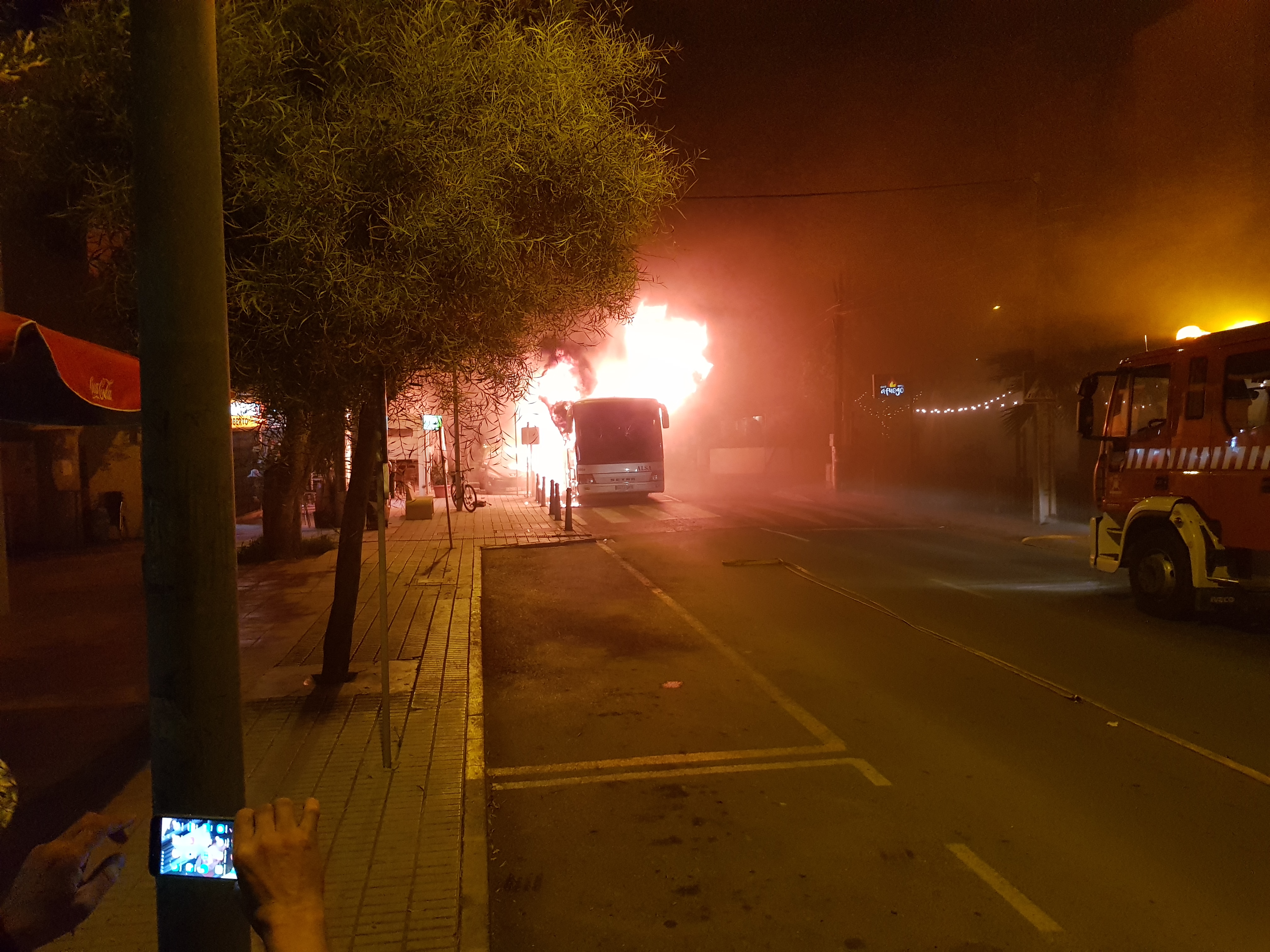 @Noudiari / El autobús de la compañía Alsa que cubre la ruta entre Platja d’en Bossa y Sant Antoni, en la Isla de Ibiza, ha empezado a arder a su paso por la calle de Les Begònies, en Sant Jordi, alrededor de las diez de la noche de este miércoles. El bús ha sido pasto de las llamas, que lo han quemado por completo. En el momento del suceso, en el vehículo de servicio público viajaban solo dos personas, el conductor y un cliente, que han salido ilesos.