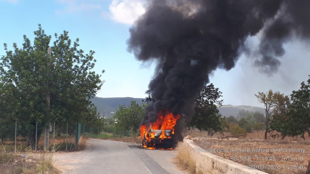 NouDiari / La Policía Local de Sant Antoni intervino, junto a un equipo de Bomberos, en un incendio de un vehículo que circulaba por la calle Cirerers, en ses Païsses.