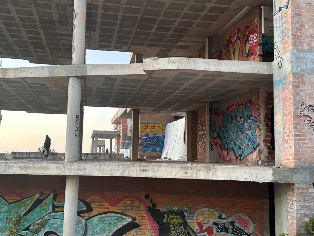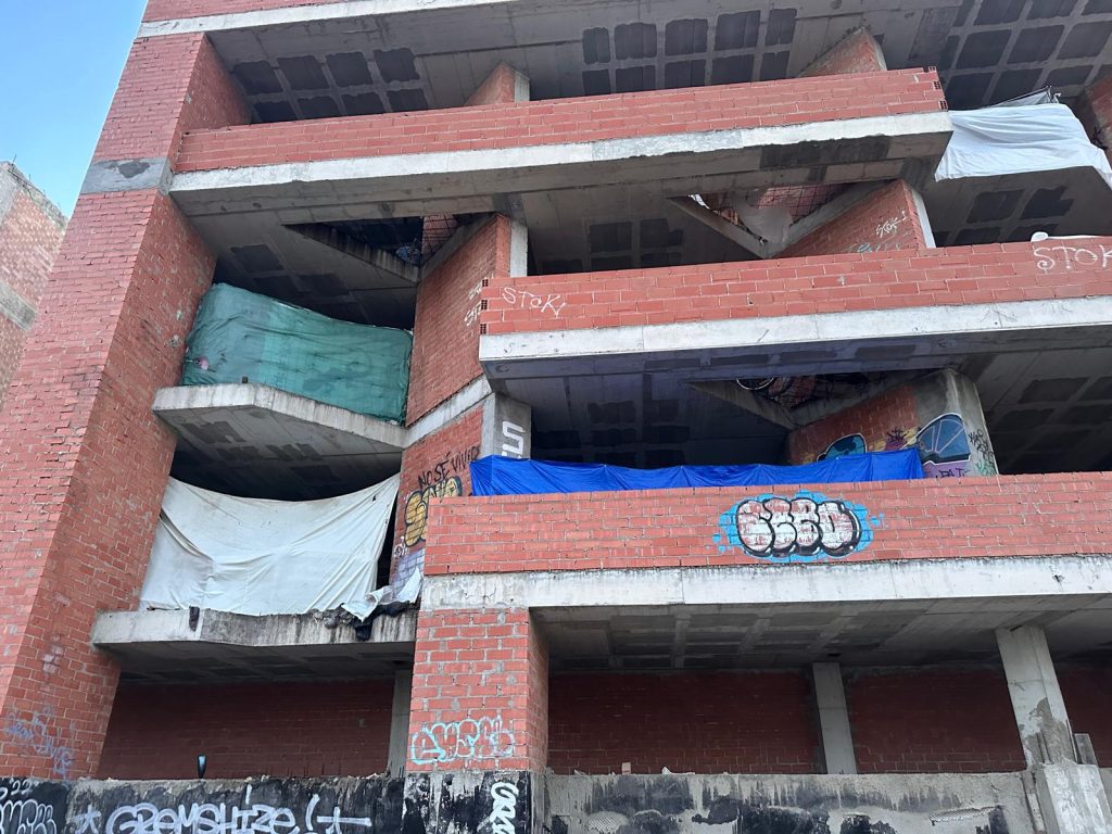 Sin embargo, casi un año después, el estatus de este derribo sigue en pendiente, y el esqueleto de hormigón vuelve a proveer un peligroso techo para quienes lo habitan.