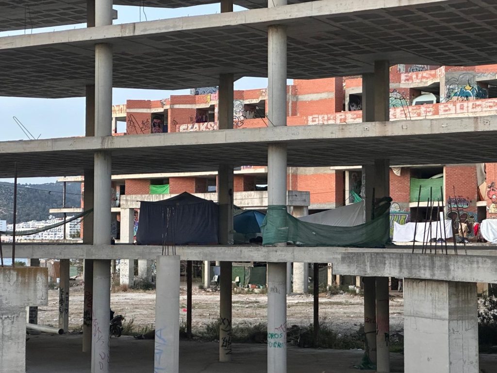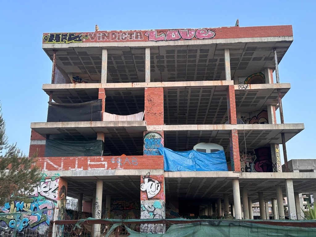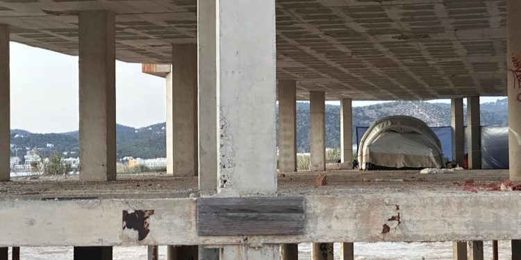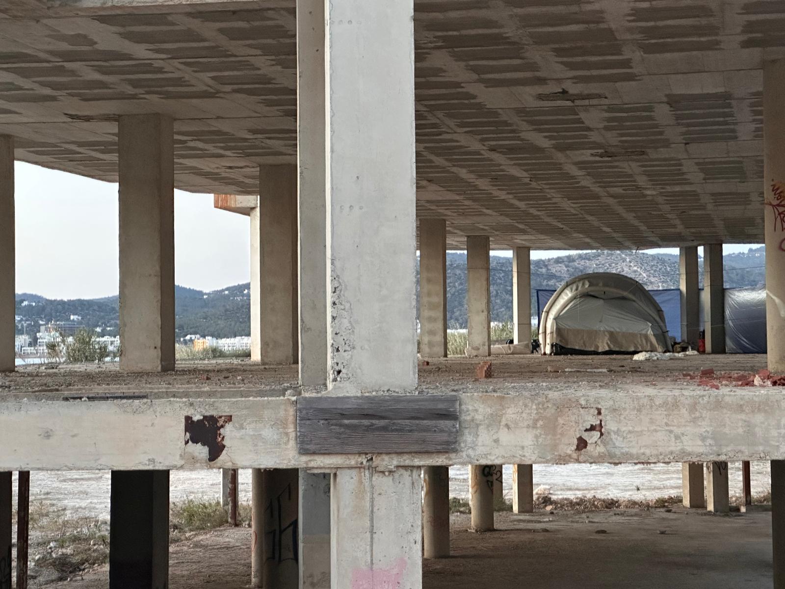 El hotel abandonado en su esqueleto de hormigón en el litoral de Cala de Bou ha vuelto a recibir huéspedes que buscan el refugio de un techo en Ibiza, con el comienzo de la temporada. Así lo ha podido verificar Noudiari insitu, y es que en las últimas semanas se ha podido observar que hay un mayor número de infraviviendas, telas colocadas a modo de protección, tiendas de campaña y personas transitando el edificio de Punta Xinxó.