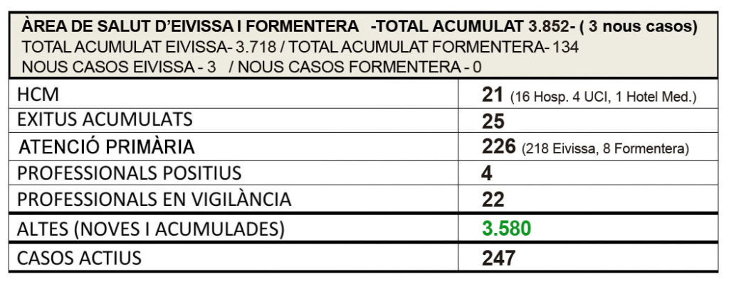 Ayer también se dieron siete nuevas altas, con lo que los pacientes activos siguen en descenso hasta los 247 casos, 238 correspondientes a Ibiza y 9 a Formentera.