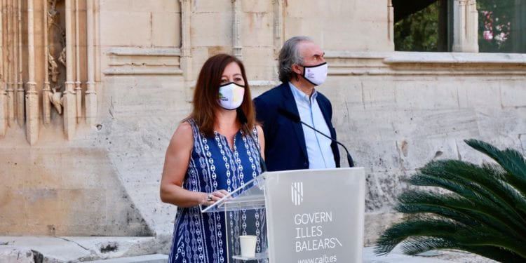 La presidenta y el conseller de Educación y Formación Profesional, Martí March, han presentado este miércoles en el patio del Consolat de Mar, sede del Ejecutivo, el texto de la ley a los miembros de la Comisión Permanente del Consejo Escolar de las Islas Baleares.