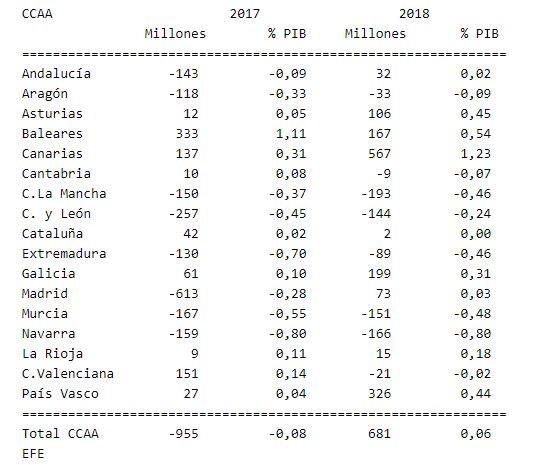 El siguiente cuadro recoge por comunidades la capacidad (+) o necesidad (-) de financiación, en millones de euros y en porcentaje de PIB, registrada en julio, en comparación con el mismo periodo de 2017: