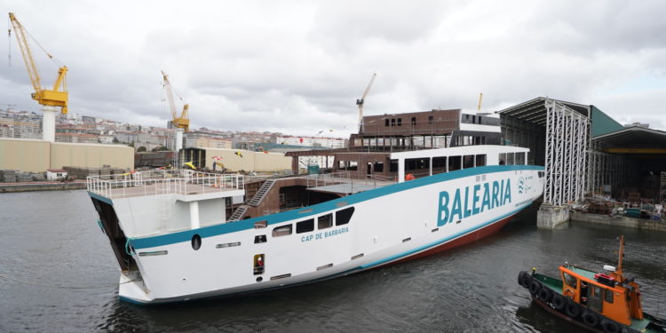Baleària ha botado hoy el primer ferry eléctrico de España de pasaje y carga con emisiones cero en las estancias y aproximaciones a puerto. Esta tarde el ferry Cap de Barbaria ha tocado agua por primera vez en Astilleros Armon Vigo, donde está siendo construido, en un acto que ha incluido el bautizo del buque.