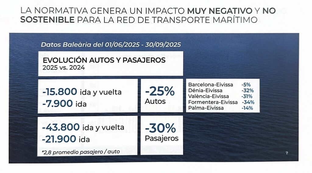 El descenso ha afectado a todas las rutas entre la península e Ibiza —Barcelona, Valencia, Denia y Palma— y también a los enlaces con Formentera. “Son cifras reales y preocupantes”, subrayó Utor, quien precisó que la reducción del tráfico marítimo apenas ha supuesto un impacto medio de 248 coches menos circulando al día, frente a un parque móvil total de más de 120.000 vehículos en la isla.
