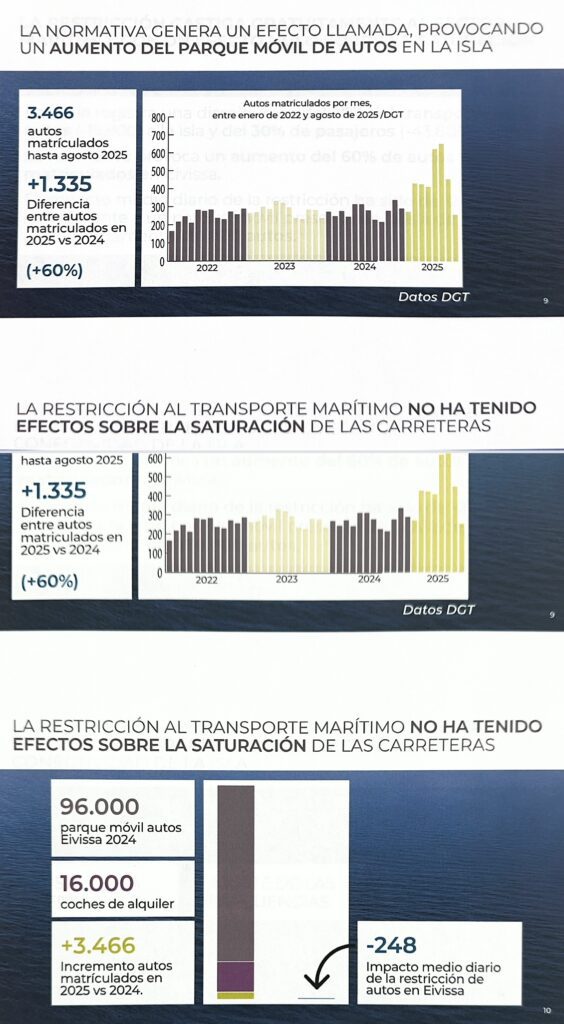 El informe de Meteoclim citado por Baleària también apunta a un “efecto llamada” derivado de la normativa: las matriculaciones de coches en Ibiza aumentaron un 60% en 2025, con 3.466 vehículos nuevos registrados entre febrero y septiembre. “Mientras se restringen los coches que llegan en barco, se disparan los que se matriculan en Ibiza. El elefante está dentro, no fuera”, ironizó Utor. Una idea que remarcó varias veces durante su intervención: que es el parque móvil actual de Ibiza, sobresaturado, el que provoca esa sensación de colapso y que los residentes notan todo el año.