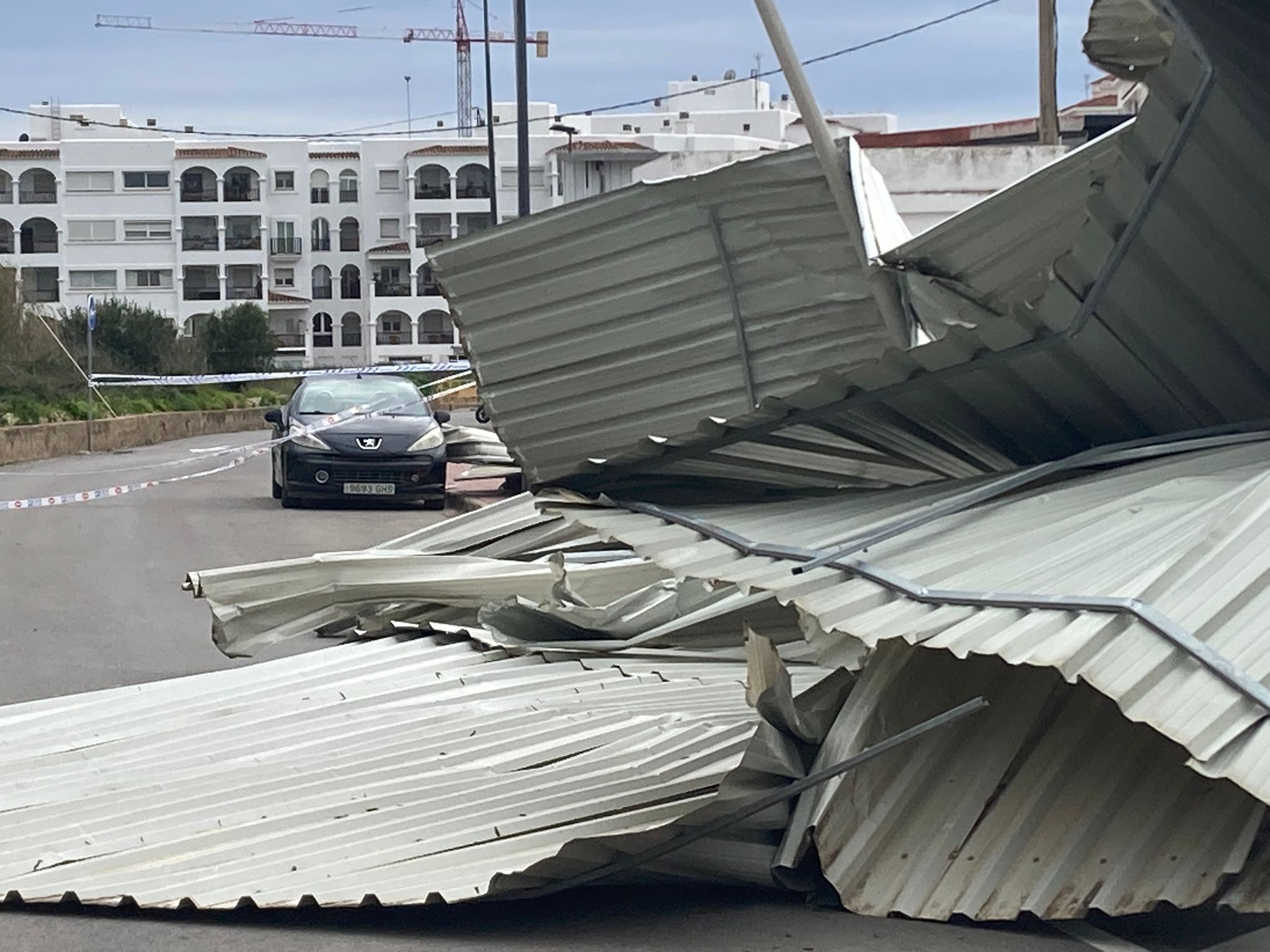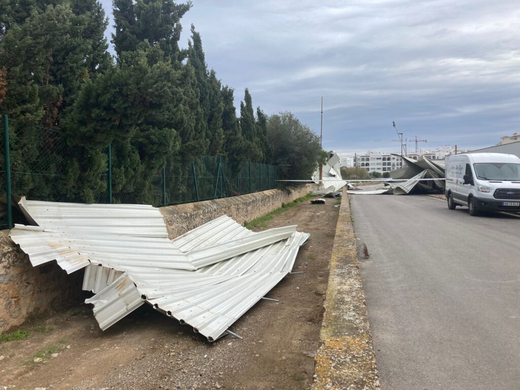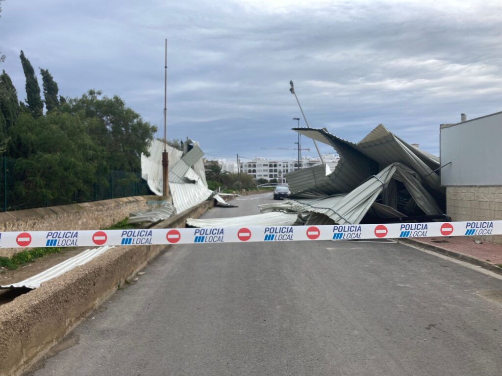 El municipio de Ibiza vivió ayer uno de esos vendavales que ponen los pelos de punta y que no se olvidan. Un total de nueve árboles caídos y otras tantas señales derribadas por las rachas de viento, es el balance provisional, a la espera de conocer el estado de las playas del municipio, ya muy golpeadas por temporales anteriores. La peor parte se la ha llevado un espacio de titularidad privada, el polígono Eurocentro, ubicado en la entrada de Ibiza por la avenida de Santa Eulària donde la cubierta de planchas metálicas de una gran nave se desprendió y salió despedida por la fuerza del aire, impactando contra el aparcamiento del supermercado Eroski y unas calles adyacentes.