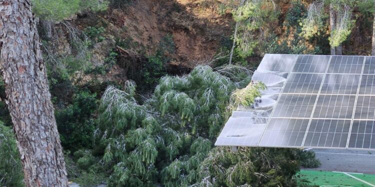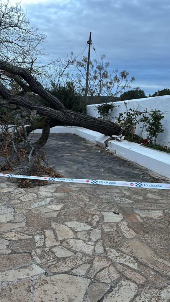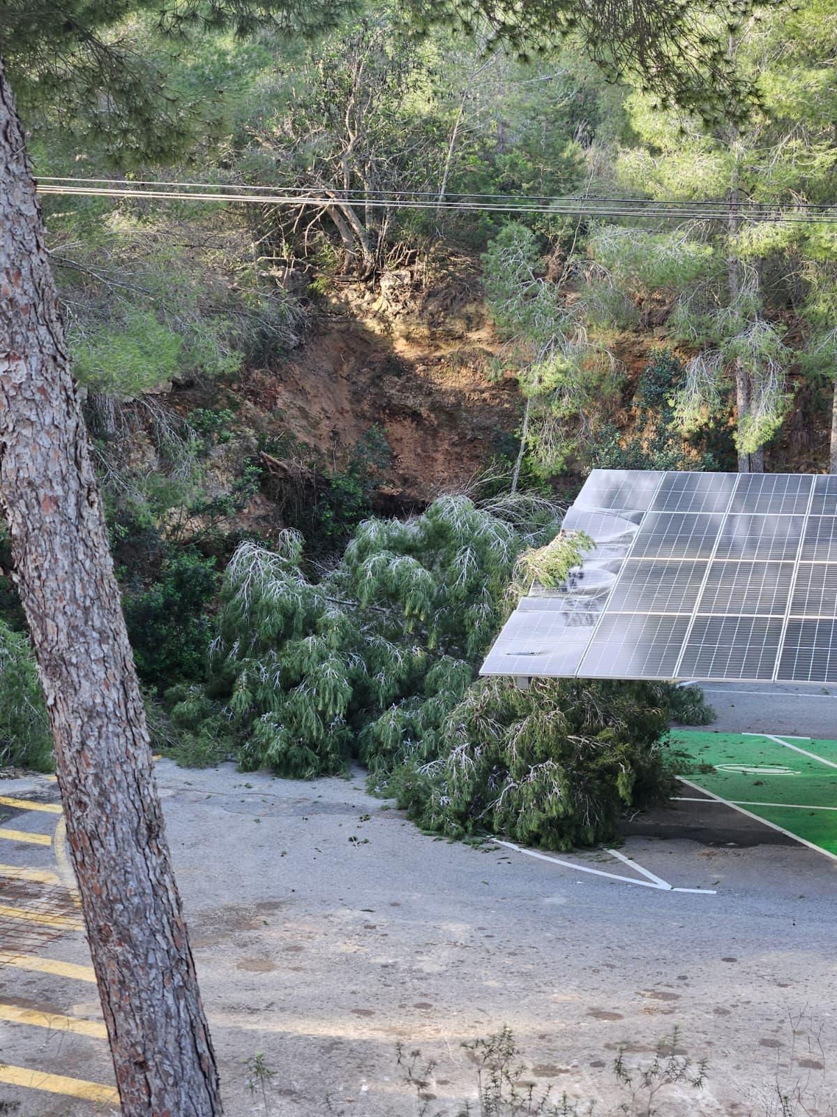 De los 19 avisos atendidos, 15 han estado relacionados con la caída de árboles en distintos puntos de Sant Joan. Además, se ha producido un desprendimiento de tierras y la caída de una farola golpeada por un árbol. En las pabellón municipal deportivo se han desplazado varias placas solares y también se ha registrado un árbol caído sobre placas solares en la zona de s’Arenal Petit.