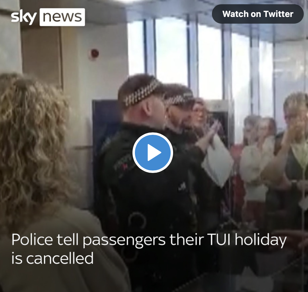 Police read out a statement on behalf of TUI telling stranded passengers at Manchester Airport their flights and package holidays were cancelled.