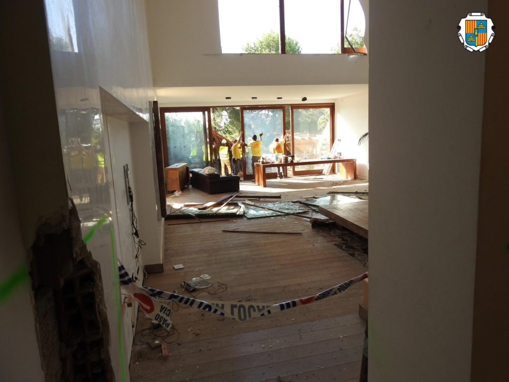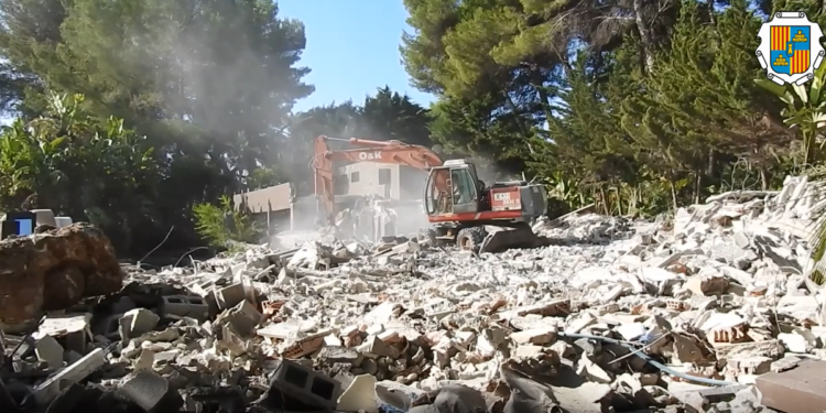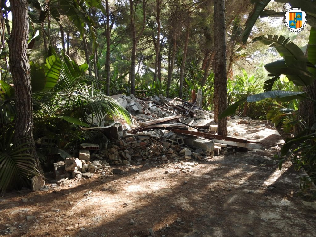 Nuevo material gráfico facilitado por el Ayuntamiento de Sant Josep sobre el proceso de derribo de todo lo ilegalmente construido (unos 2.000 metros cuadrados, que incluyen una piscina) muestra el avance de los trabajos de demolición del complejo, que sigue «a buen ritmo y sin incidencias», explican desde el Consistorio.