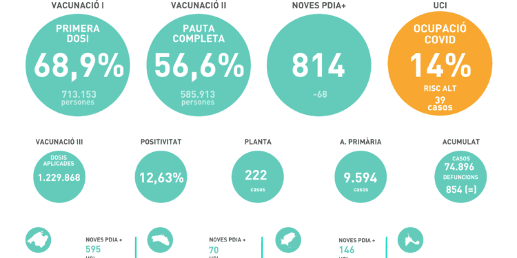 Según ha informado el Govern en su balance diario, en las unidades de cuidados intensivos hay 39 pacientes con covid (5 más que el jueves) que ocupan el 14 % de las camas y en planta de los hospitales hay 222 infectados (21 más).