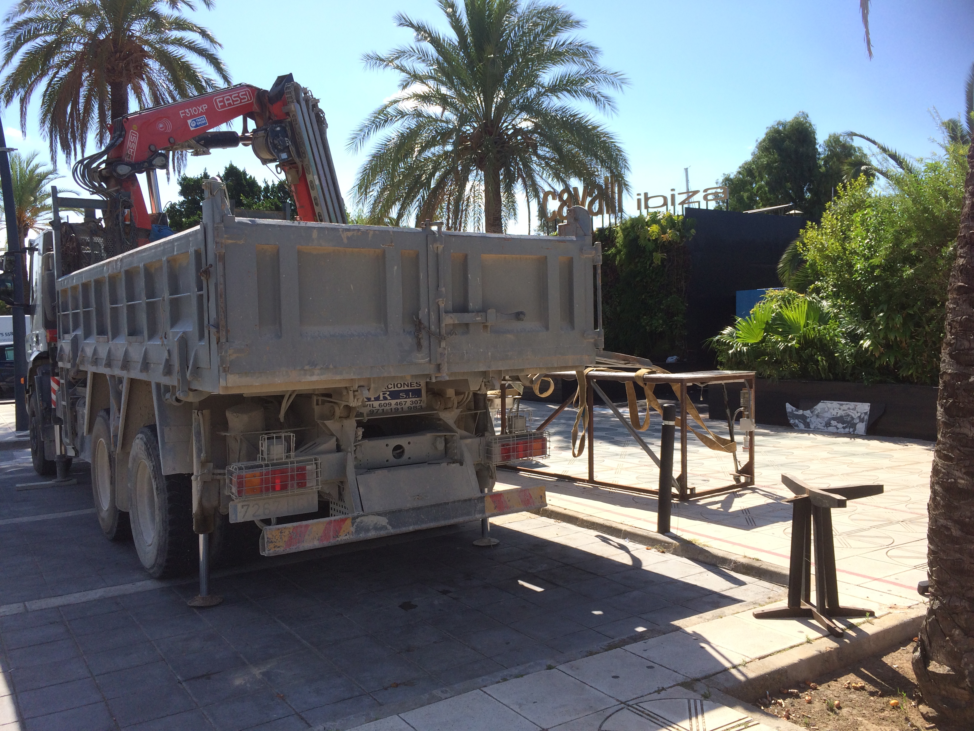 El personal del restaurante del diseñador Roberto Cavalli ha comenzado a retirar la terraza con la que ocupaba la zona verde del paseo de forma irregular mediante un exceso de ocupación de vía pública, denunciado por el Ayuntamiento de Ibiza.