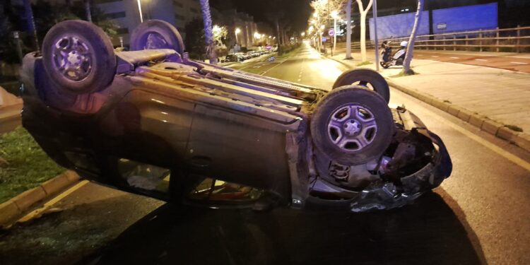 Esta pasada madrugada, sobre las tres, se ha registrado un aparatoso accidente en la calle Corona, en dirección al barrio de Can Misses de la capital de Ibiza. Un vehículo Dacia Duster, que seguía una errática trayectoria, ha colisionando contra una palmera, la ha derribado y ha quedado volcado con las cuatro ruedas hacia arriba en medio de la calzada.