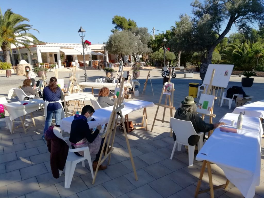 Per participar en aquesta sessió de creació a l’aire lliure no es requeria un nivell concret, així que per comptes de fer pintura al natural, Tristán ha optat per donar una classe als assistents per a la que ha preparat l’estudi d’una escena típica del paisatge eivissenc amb un esbòs que els participants, al voltant d’una desena, han reproduït a l’oli durant tot el matí.