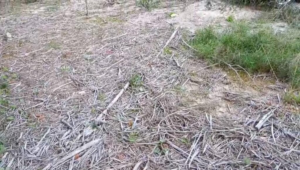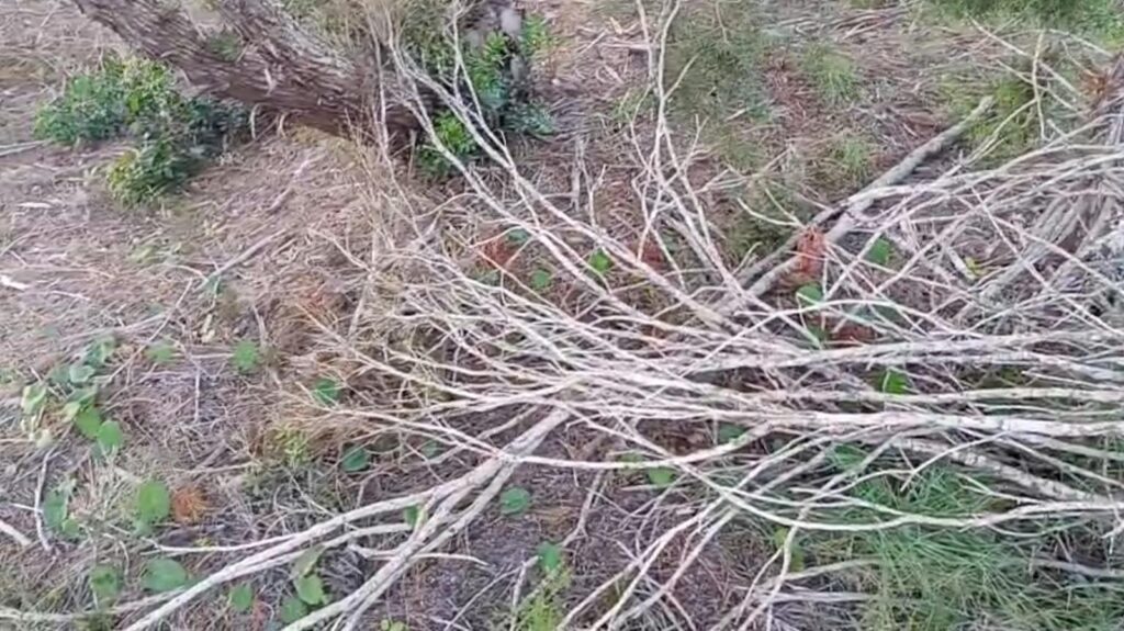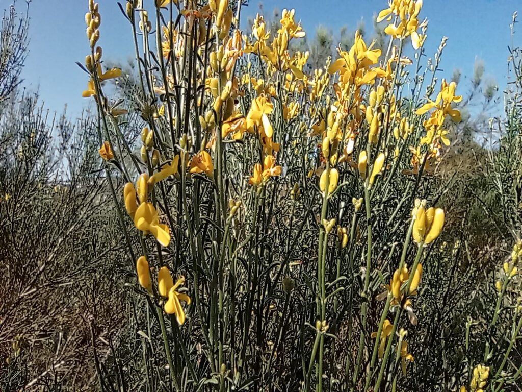 La genesta que crece en la zona y, abajo, la vegetación seca tras ser aplastada y/o arrancada.