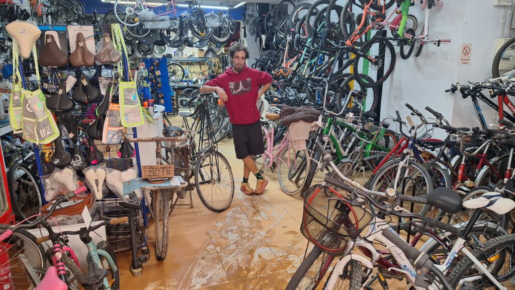 Arturo Bandrés posa en el interior de La Cicloteca, con todavía barro por quitar. / D.V.