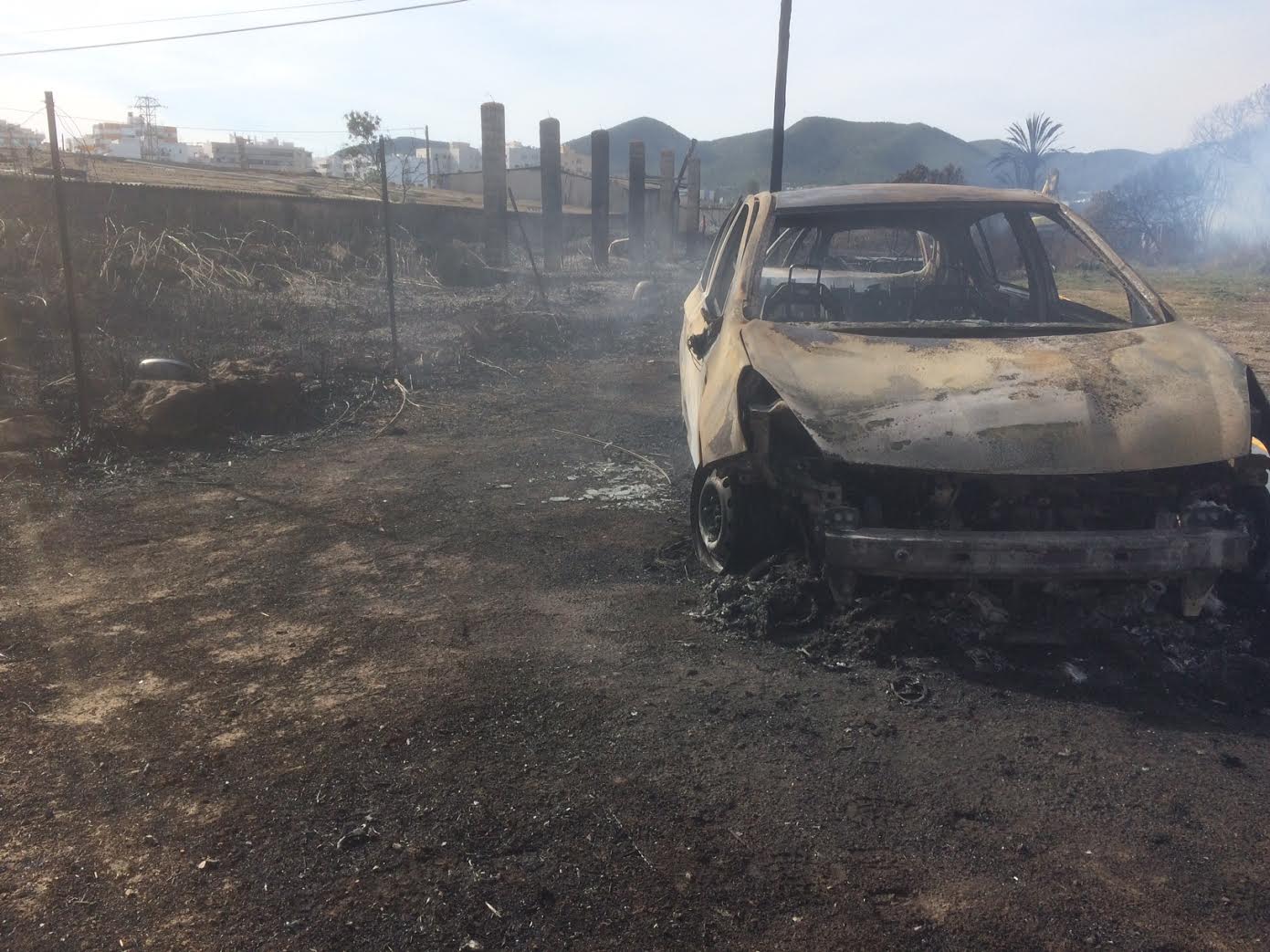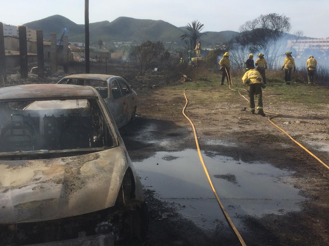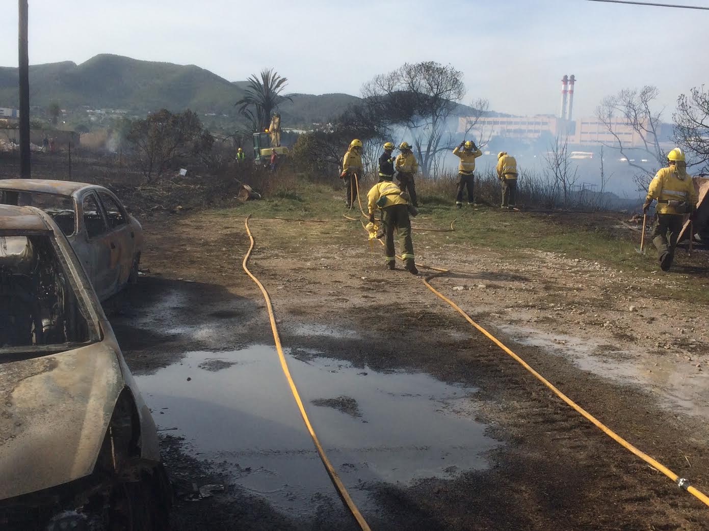 Ruiz ha querido agradecer el trabajo tanto de los bomberos como de los agentes del Ibanat, Protección Civil y Policía Local, que a estas horas siguen en ses Feixes para dar por extinguido el incendio. “Uno de los primeros objetivos era proteger dónde estaban los talleres y se encontraba material inflamable”, ha destacado Ruiz, que ha señalado que a pesar de que la zona que rodea al Taller Pituso está totalmente calcinada “se ha evitado que entrase el fuego” en el interior de las instalaciones. Aún así, frente a la sede del Club Náutico de Ibiza se pueden observar, al menos, cinco vehículos totalmente calcinados.