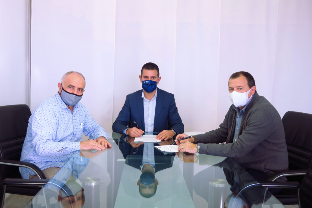 NouDiari / El alcalde de Sant Antoni, Marcos Serra, junto al primer teniente de alcalde y concejal de Comercio, Joan Torres, y el presidente de la Asociación de Comerciantes de Sant Antoni, Joan Ribas, han firmado esta mañana el convenio de colaboración para la promoción y dinamización comercial del municipio.