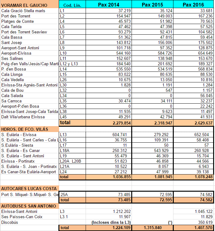 En la siguiente tabla se pueden apreciar los viajeros de cada línea en los últimos tres años así colos incrementos y disminución de pasajeros en las diferentes líneas del servicio público de autobús de Ibiza.