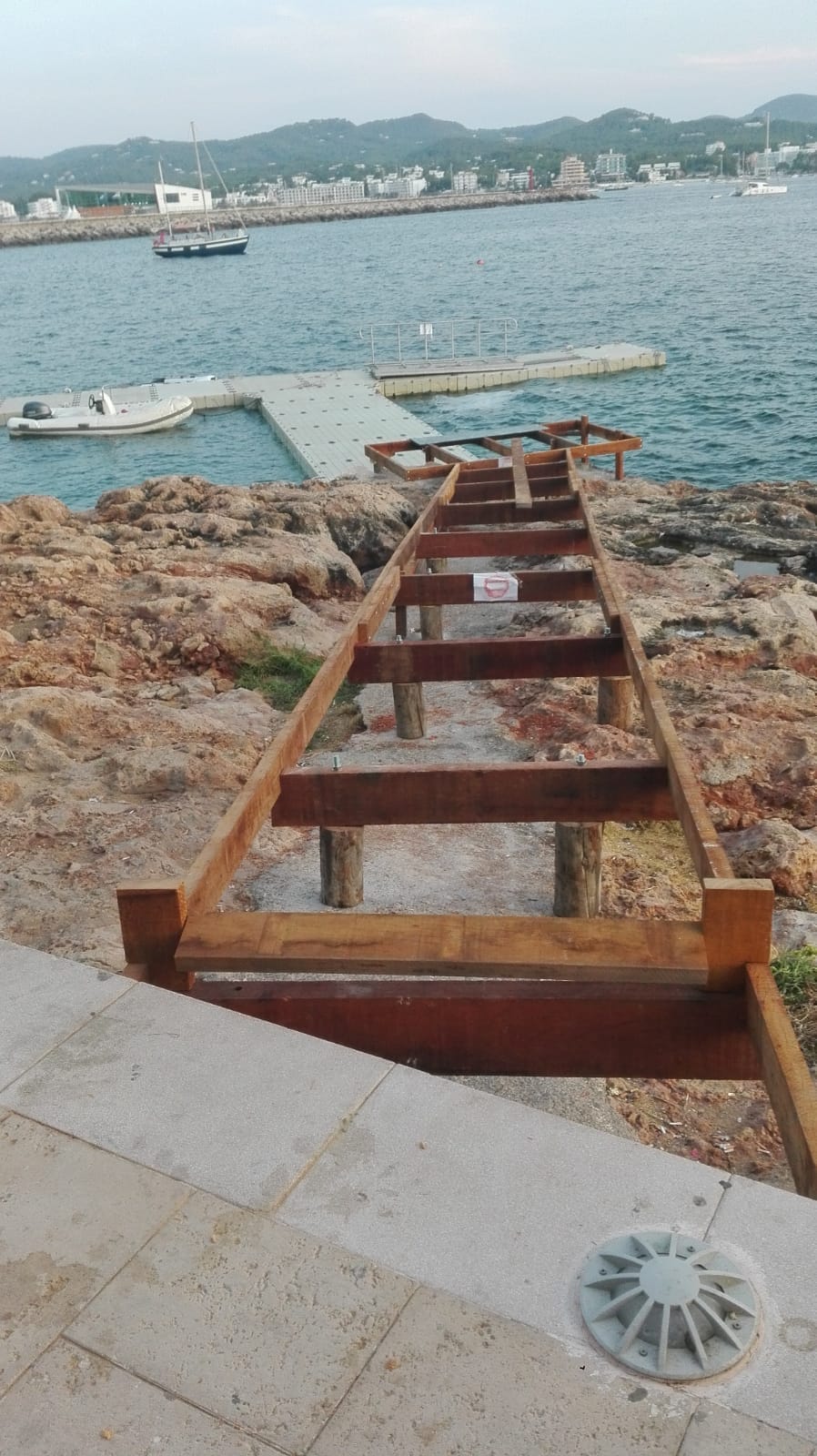 @Vicent Torres / El Partido Popular ha criticado al Ayuntamiento de Sant Antoni por la instalación de una pasarela y un punto de atraque en el Passeig de Ponent que impide «el paso libre de personas por las rocas».