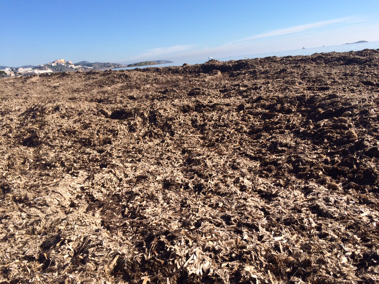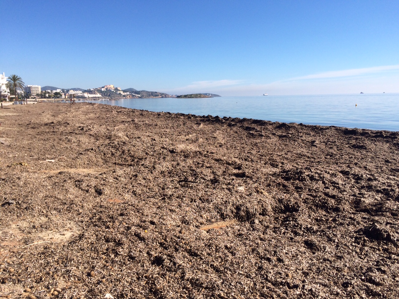 El temporal de viento que azotó el pasado lunes la isla de Eivissa, en concreto, la costa sureste, ha provocado que la posidonia oceánica, ya seca, se acumule en la orilla con el objetivo de proteger la playa de la erosión que causan estos mismos temporales y actuando así como parapeto y atrapar la arena. Es una forma de autoprotegerse durante los duros meses de invierno.