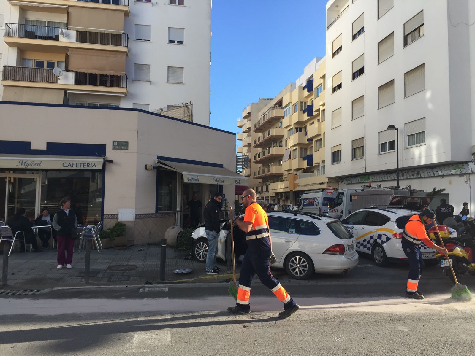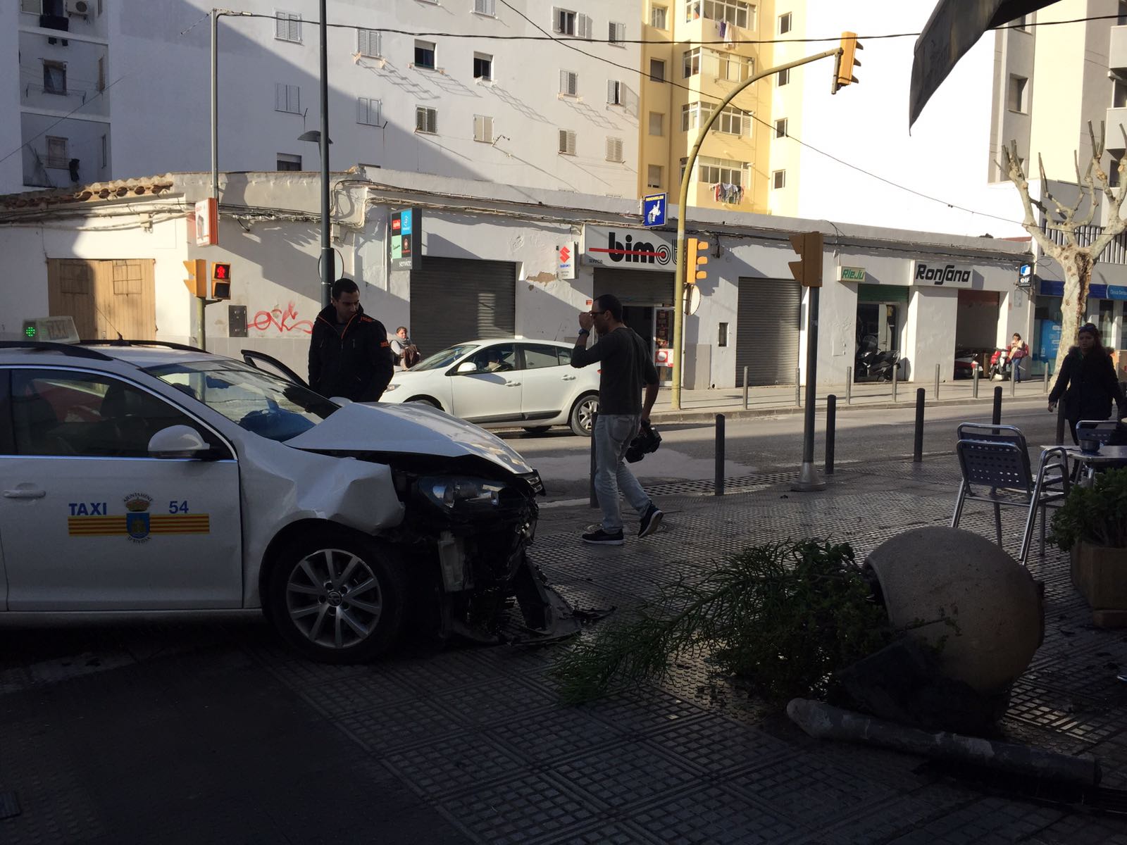 Por el impacto de la colisión, el taxi perdió el control y se dirigió hacia el bar Mylord, ubicado en la esquina, chocando contra una de las grandes jardineras de la terraza de local. Por el impacto, la jardinera terminó contra la fachada del establecimiento.