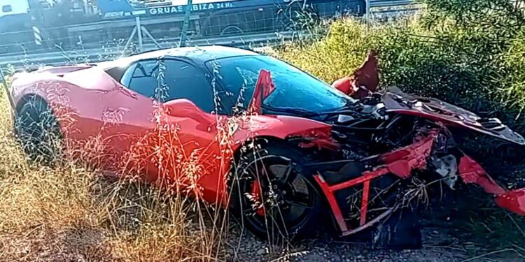 Varios equipo de auxilio en carretera de la empresa Grúas Ibiza se han encargado de retirar los vehículos de la carretera y el descampado al que ha ido a parar el deportivo de lujo de la marca italiana.