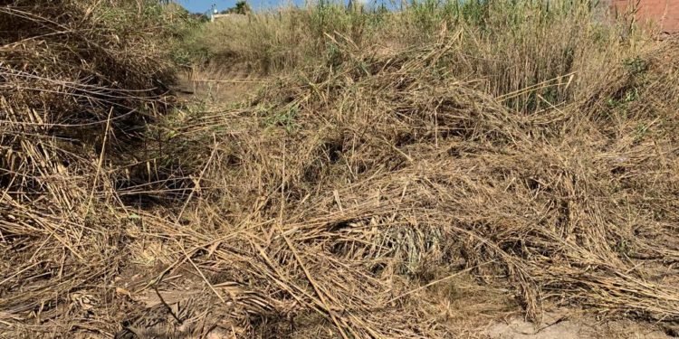 Como se aprecia en la imagen, centenares de cañas cortadas en los trabajos de limpieza han quedado esparcidas en montones en el centro del cauce desde el pasado jueves en la zona conocida como can Nadal.
