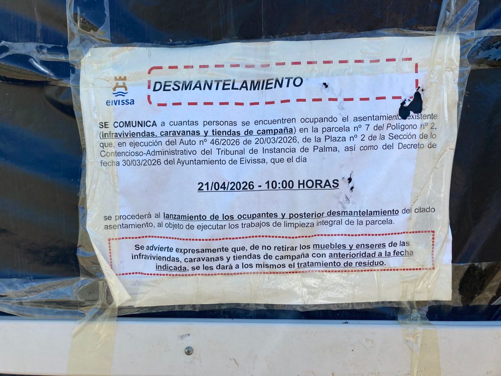 El Ayuntamiento de Ibiza, mediante la Policía Local, inició a primeros de abril las notificaciones a los residentes de este asentamientos, donde según las autoridades residían hasta hace poco 130 personas. Desde el Ayuntamiento de Ibiza han informado de que hay seis casos de personas vulnerables en seguimiento y de que Servicios Sociales estarán presentes durante el desmantelamiento en caso de que sea necesario su apoyo.