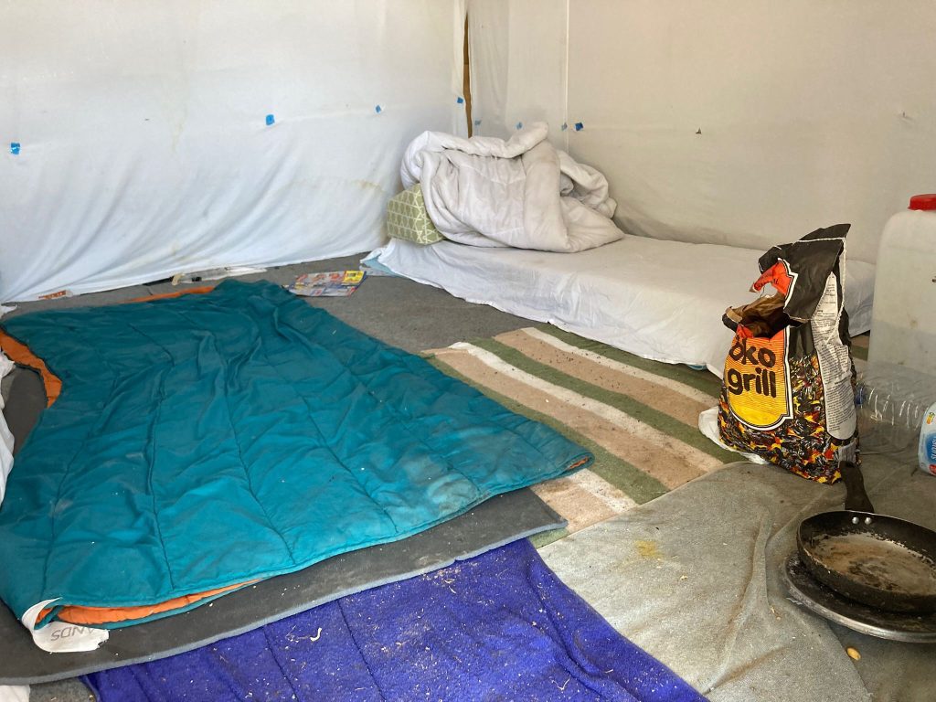 Cerca de las 9 de la mañana de este lunes, a un día del desalojo, de una de las primeras tiendas del asentamiento en la zona más cercana al párking de sa Joveria salen Salek y Ali, dos jóvenes de 26 y 27 años respectivamente. Recogen botellas y basura que otros han dejado alrededor de su tienda, a su marcha. Otro compañero de casa prepara cuatro tés en un pequeño camping-gas. Hace más de seis meses que han iniciado su petición de estatus de apátrida, a la que se acogen la mayoría de saharauis en España.